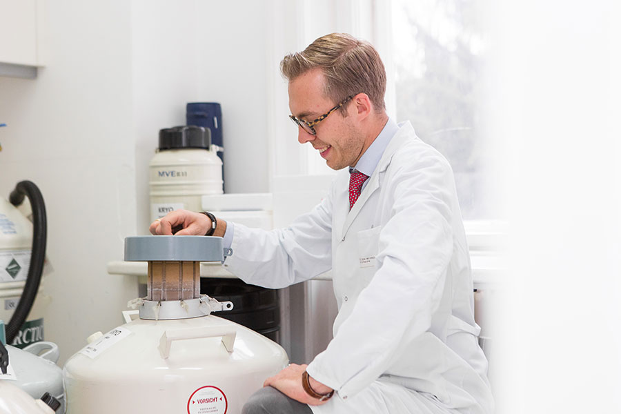 Nach der Entnahme werden deine Eizellen in unserem Speziallabor schockgefroren (Vitrifikation) und bei -196 °C in flüssigem Stickstoff eingelagert. Die Lagerung ist anonymisiert und sicher, wird regelmäßig kontrolliert und im Wunschbaby Institut Feichtinger unbegrenzt möglich.